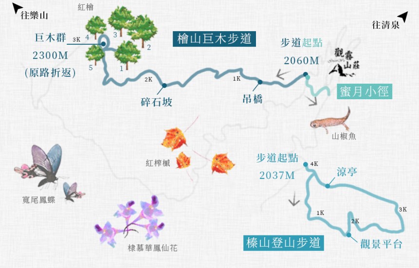 是條視野極佳的環狀步道,除此之外動植物生態豐富,是賞花、賞鳥的好地方!步道口就位於觀霧山莊旁,為O型步道走一圈約4公里,若加上通往步道的大鹿林道西線路程,全程約8公里,如果天氣晴朗,能夠遠眺聖稜線自雪山、北稜角,到泰雅族聖山-大霸尖山等名山百岳的壯闊景致。