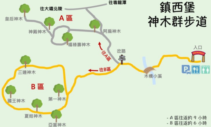 登山口→(40分)→AB區岔路口→(15分)→B區環狀岔路口→(5分)→亞當夏娃神木→(20分)→國王神木→(25分鐘)→三連神木→(35分鐘)→B區環狀岔路口→(60分鐘)→AB區岔路口→(40分)→登山口